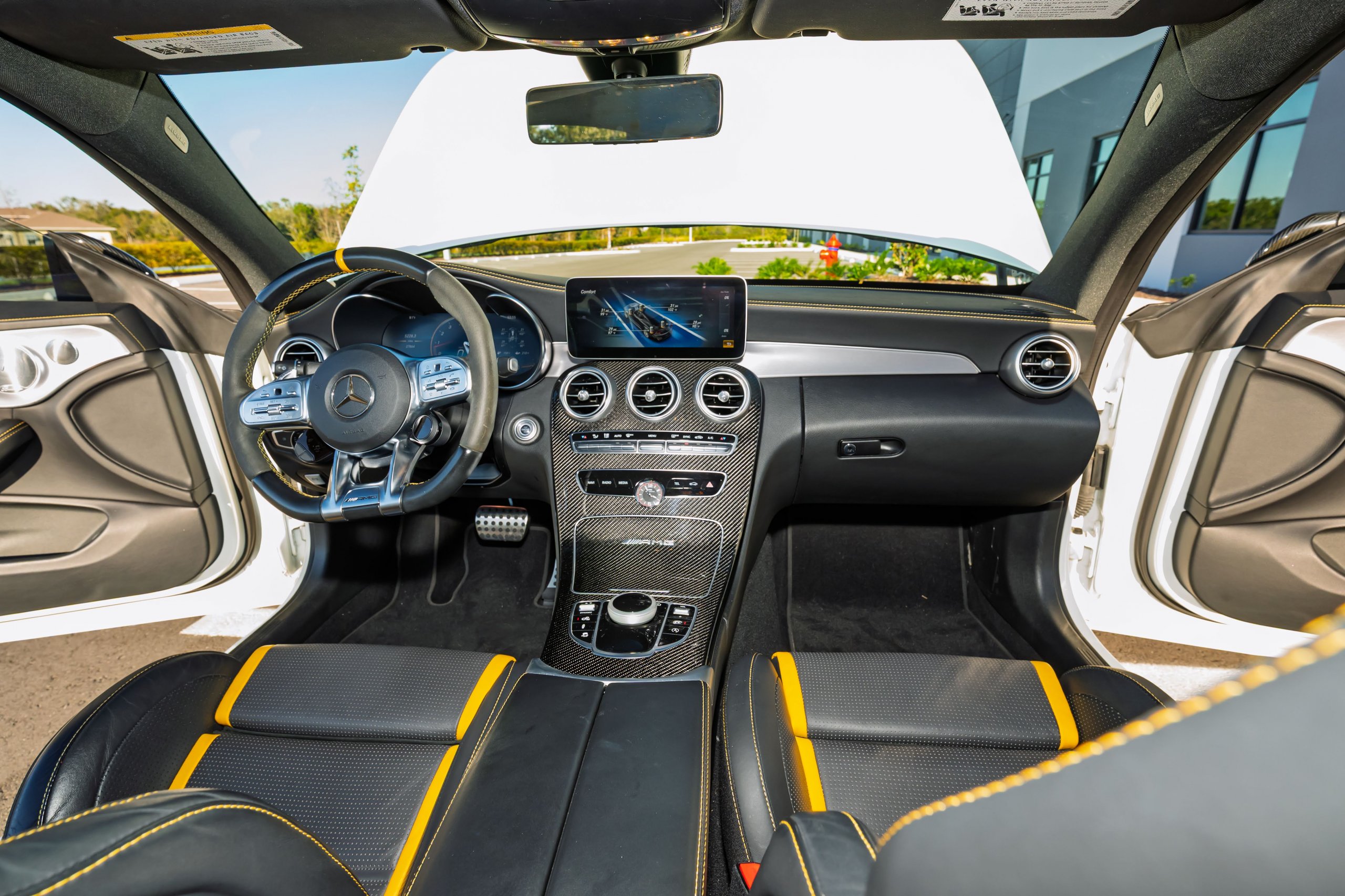 This 2021 Mercedes-AMG C63 S Coupe is a true expression of modern German performance and luxury, finished in Polar White with a Magma Grey/Black leather interior w/ Yellow Stitching. It is a late-production 2021 build, completed in October 2021, which includes the updated infotainment controller that improves usability and overall cabin refinement. Its handcrafted 4.0L twin turbo V8 delivers the thrilling character the C63 S is known for, and the aftermarket exhaust amplifies the sound into a deep and aggressive tone that gives the car a commanding presence on every drive. In Comfort mode the exhaust settles into a refined, quiet note that is perfect for the neighborhood or relaxed highway cruising, while the sportier modes open the car up and unleash the full, intoxicating AMG soundtrack. It carries an impressive list of factory AMG upgrades that elevate both style and capability. Highlights include AMG Performance Seats, AMG Performance Interior & Exterior, the AMG Aerodynamics Package, the AMG Exterior Carbon Fiber Package, carbon fiber mirror caps, an AMG carbon spoiler lip, and AMG styling enhancements on the front spoiler and side skirts. The calipers were painted yellow to complement the interior accents, and the driver and passenger windows are tinted for a sleek, cohesive appearance. The car has been garage kept and meticulously maintained, and it recently received a full detail that included a complete exterior clay bar treatment and a high quality sealant application. Earlier this spring the rear bumper received cosmetic repair after a minor low speed tap at a stoplight, with all work completed by Autonation Collision Sarasota. In May 2025 at 25,963 miles, Service Pkg. B + Brake Fluid Flush was performed by a local Mercedes specialist shop (included in attached files). Both keys and all books are included, making this a rare opportunity to own a clean, tastefully spec’d and properly cared for AMG coupe that delivers supercar character in a refined package.